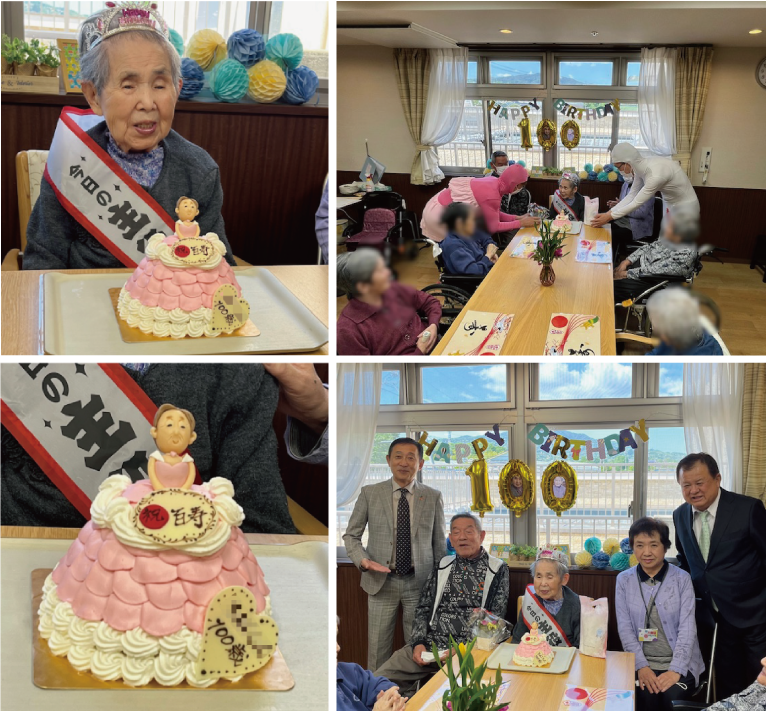 「藤岡の楽園」のCさんの記念すべき100歳のお誕生日会をご家族、ユニットのお仲間、職員のみんなでお祝いしました。ご本人から元気なご挨拶のあと、ご本人激似のケーキが理事長から贈られ、みんなで美味しくいただきました。 『ありがとう。あなたに逢えてよかった』藤岡の楽園最幸の一日でした。