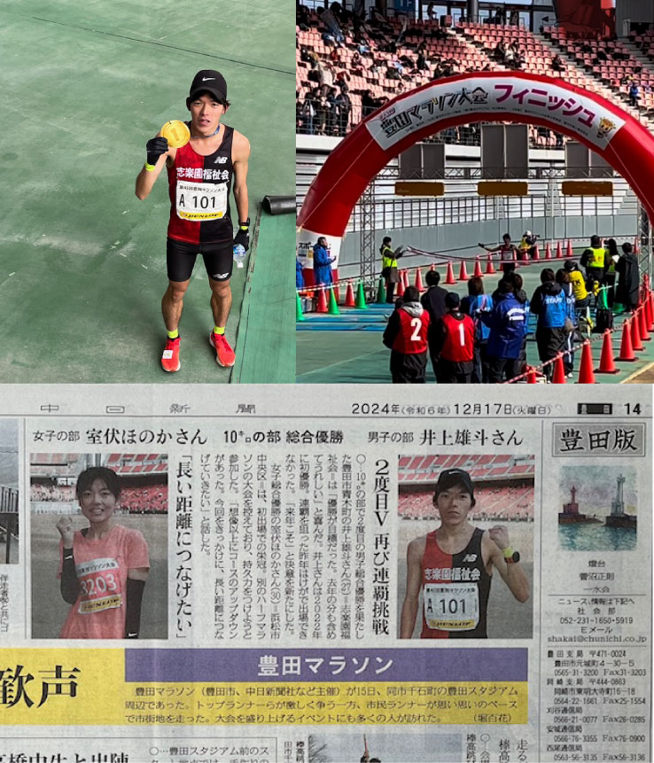 12月15日、快晴の豊田スタジアムで第43回豊田マラソン大会が開催されました。楽園陸上倶楽部からは井上・堀田・鈴木の3選手がエントリーしました。メインとなる10km競技において、井上雄斗選手(藤岡の楽園)がスタートから首位をキープし、見事2度目(2022年大会に次ぐ)の優勝を飾りました! 3選手の「志楽園福祉会」のユニフォームが豊田市内で輝きを放ちました♪
